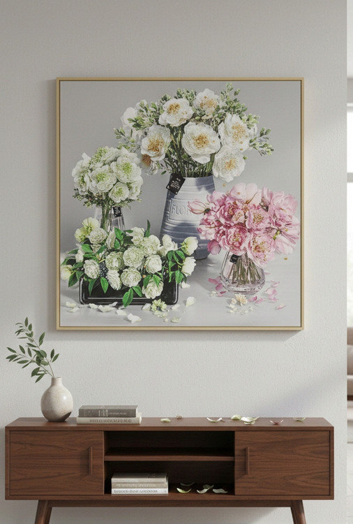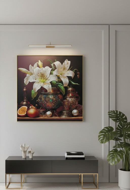 این اثر برخلاف تابلوهای معمولی، دارای بافت برجسته و نگینکاری دستساز است. استفاده از تضاد رنگی میان آبی عمیق و مس، باعث شده تا این تابلو در محیطهای با چیدمان روشن (کرم، طوسی یا سفید) به عنوان یک نقطه کانونی عمل کند و تمام توجهات را به خود جلب نماید. نگینهای به کار رفته در مرکز گل، در زیر نور شب، درخششی الماسگونه به محیط میبخشند.