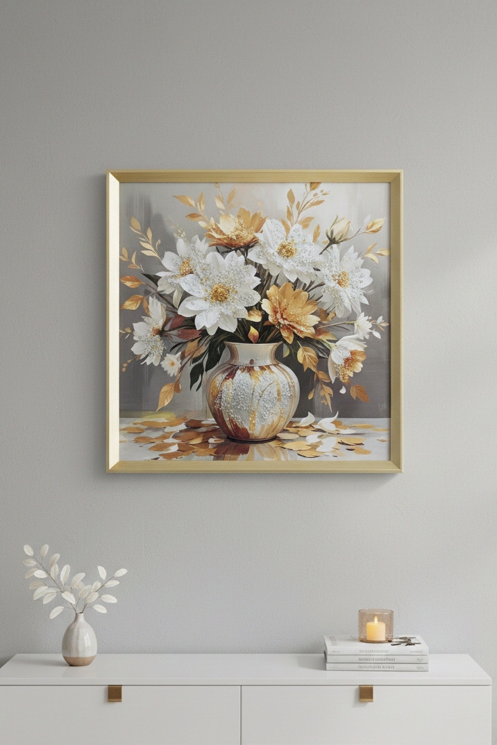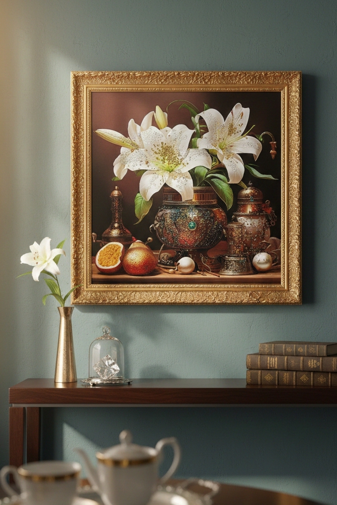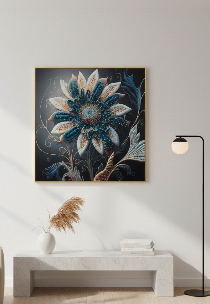 این اثر برخلاف تابلوهای معمولی، دارای بافت برجسته و نگینکاری دستساز است. استفاده از تضاد رنگی میان آبی عمیق و مس، باعث شده تا این تابلو در محیطهای با چیدمان روشن (کرم، طوسی یا سفید) به عنوان یک نقطه کانونی عمل کند و تمام توجهات را به خود جلب نماید. نگینهای به کار رفته در مرکز گل، در زیر نور شب، درخششی الماسگونه به محیط میبخشند.